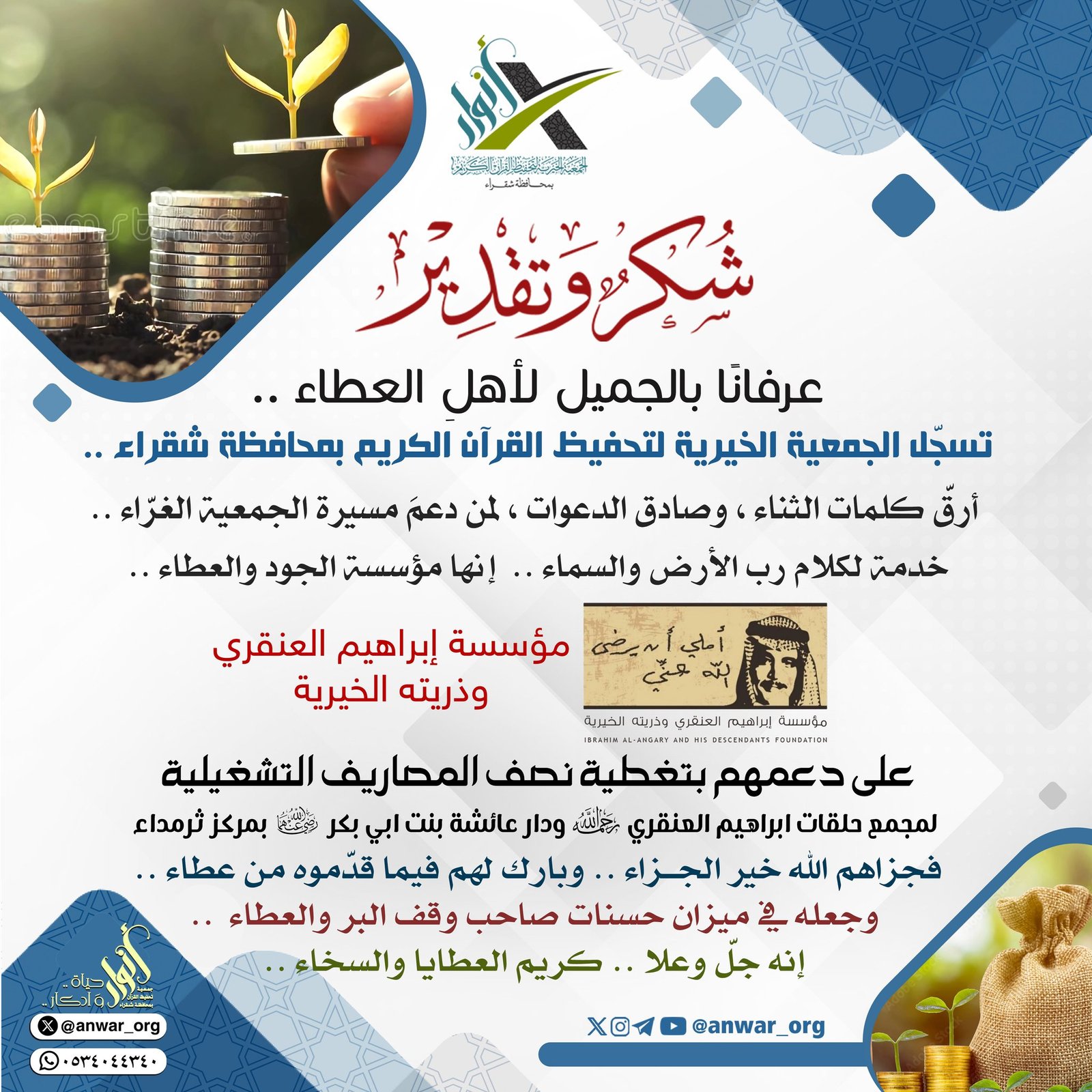 تسجل الجمعية الخيرية لتحفيظ القرآن الكريم بمحافظة شقراء جمعية أنوارأرق كلمات الثناء، وصادق الدعوات،لمن دعم [...]